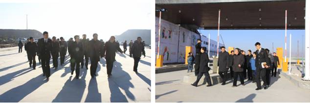 在保稅物流中心卡口上方"青海曹家堡保稅物流中心"以中英文兩種字體呈現(xiàn),海關(guān)標識赫然醒目。王黎明副省長一行在實地查看了1#、2#保稅倉庫、卡口、查驗庫、辦事大廳等設施,并邊走邊聽取物產(chǎn)集團總經(jīng)理王玉輝關(guān)于工程施工進展情況的匯報。