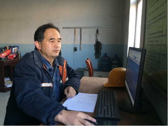 圖為:白成業(yè)(左一)在對作業(yè)長進(jìn)行現(xiàn)場培訓(xùn)