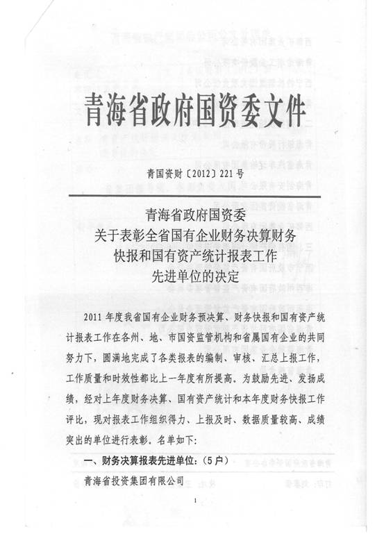 2012年,在集團(tuán)及所屬各公司領(lǐng)導(dǎo)的高度重視下,在所屬各公司的大力支持和密切配合下,在辛勤工作在財(cái)務(wù)會(huì)計(jì)崗位上的同事們的共同努力下,集團(tuán)總公司圓滿完成了省國(guó)資委和省財(cái)政廳各類(lèi)報(bào)表的上報(bào)工作,財(cái)務(wù)信息工作質(zhì)量、時(shí)效性和財(cái)務(wù)分析水平都比上一年度有所提高,受到了省國(guó)資委和省財(cái)政廳的好評(píng),集團(tuán)總公司2011年度財(cái)務(wù)決算工作被省國(guó)資委評(píng)為先進(jìn)單位,集團(tuán)財(cái)務(wù)審計(jì)部張莉青同志被省財(cái)政廳評(píng)為2012年度財(cái)務(wù)快報(bào)工作先進(jìn)個(gè)人。